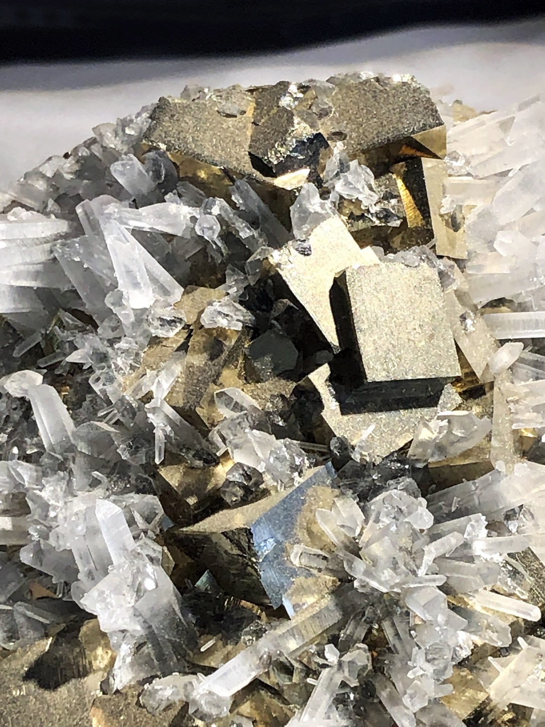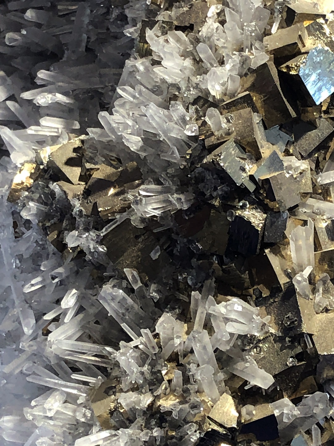 Perfect pyrite cubes (Fool’s Gold) blend with pure quartz points- thousands of tiny energy generators.